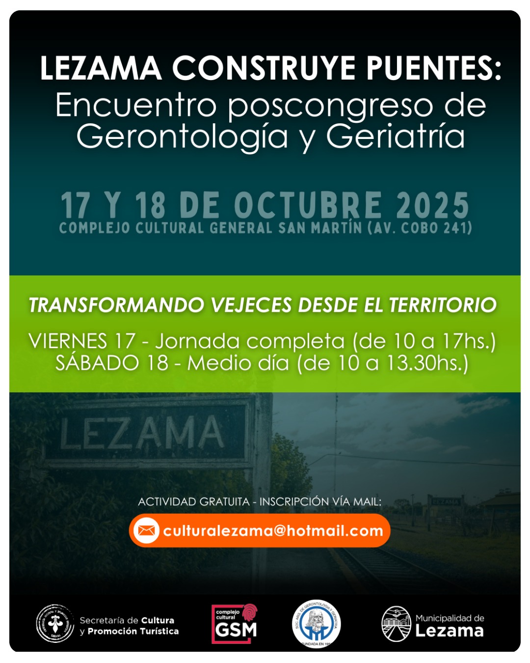 La agencia de PAMI Lezama y el municipio a través de la Secretaría de Desarrollo Social coordinan un importante evento post congreso de gerontología y geriatría, con el lema “Transformando vejeces desde el territorio”. Serán dos jornadas que tendrán lugar el 17 y 18 de octubre en nuestra ciudad, con la participación de profesionales especialistas en la materia y un abordaje multidisciplinario del adulto mayor y su entorno.